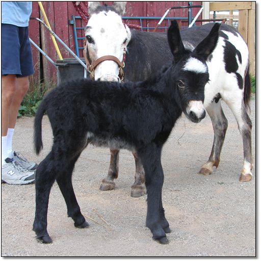 The foaling of this gorgeous black jack came right in the middle of one of the biggest donkey shows for the year. Luckily Sierra had lots of signs that she was ready to have her baby. I had come home from the show with some breeders from Texas who had wanted to see our farm and our donkeys. Joe had stayed home from the show to watch Sierra and the Marestarers had been keeping me posted on her condition. Luckily, as if it was MAGIC we were all right here on the farm the minute Sierra went in to labor.