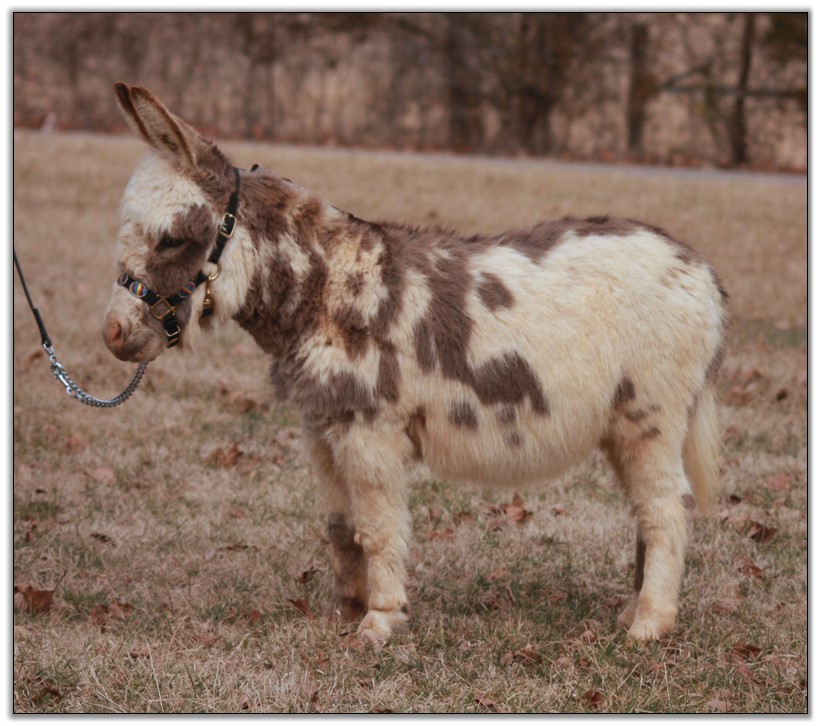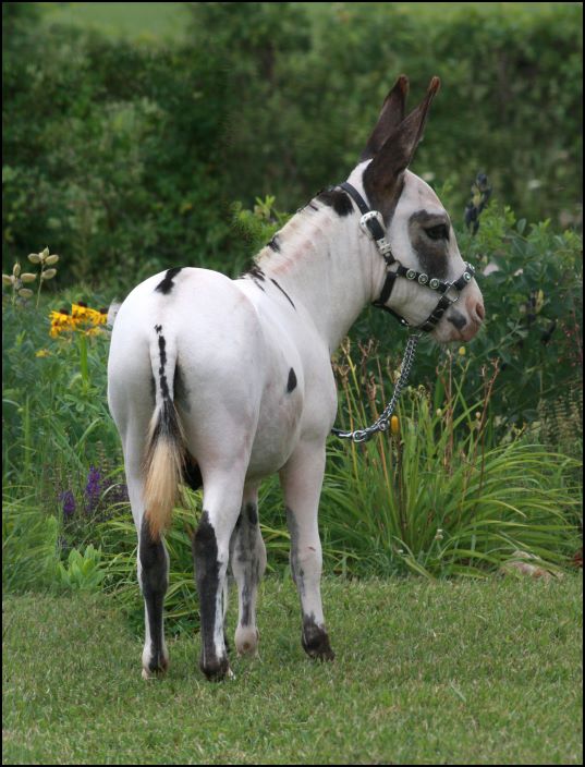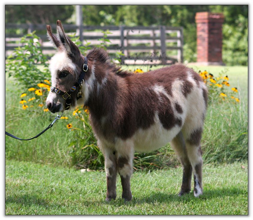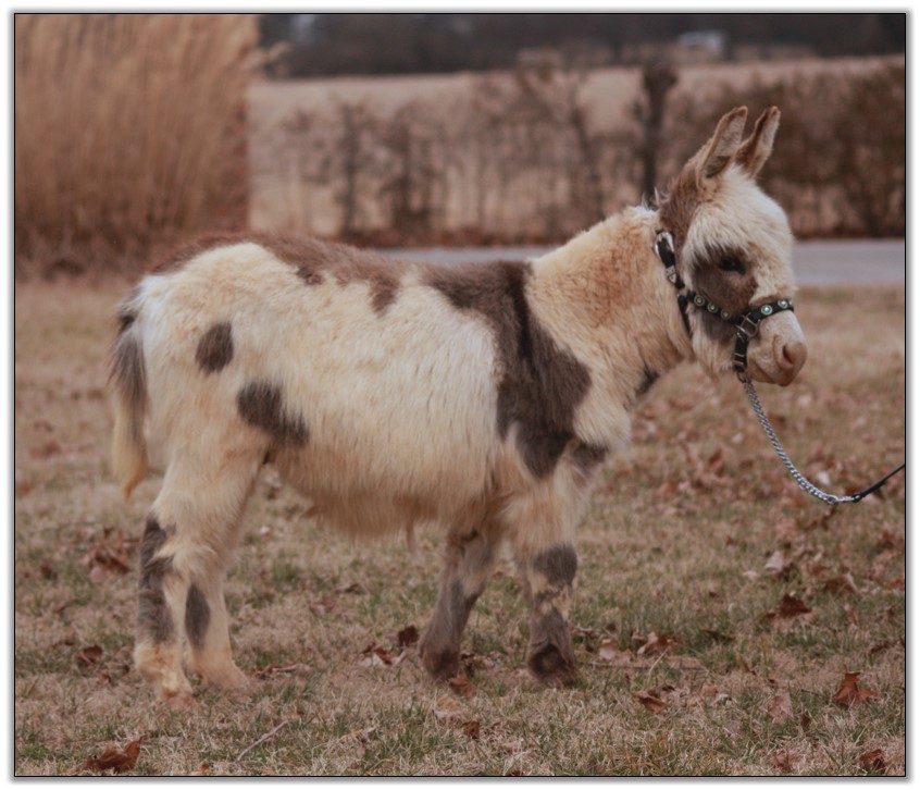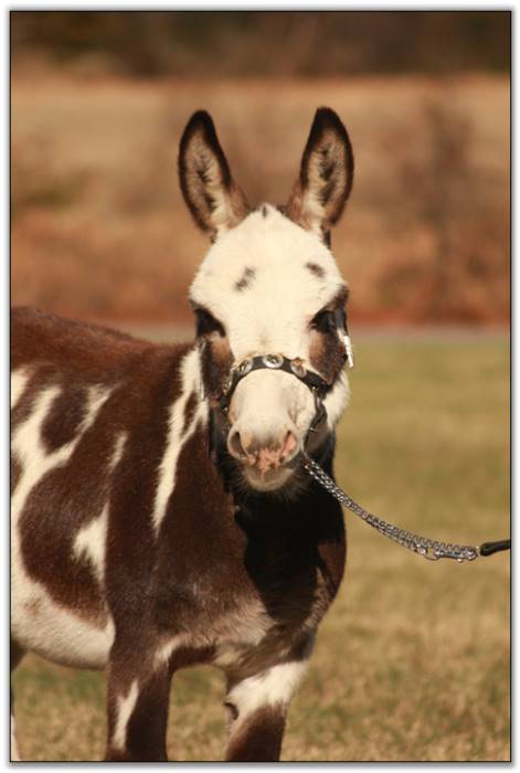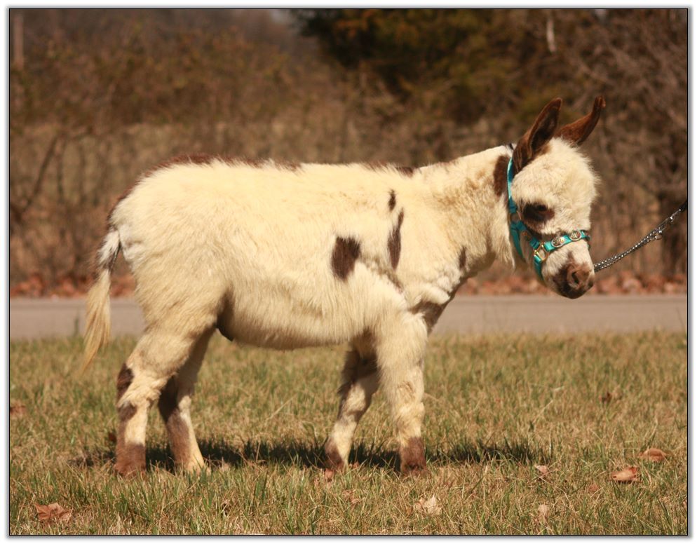 HHAA Tramp Stamp, spotted miniature donkey jennet born at Half Ass Acres Miniature Donkey Farm in Chapel Hill, Tennessee.