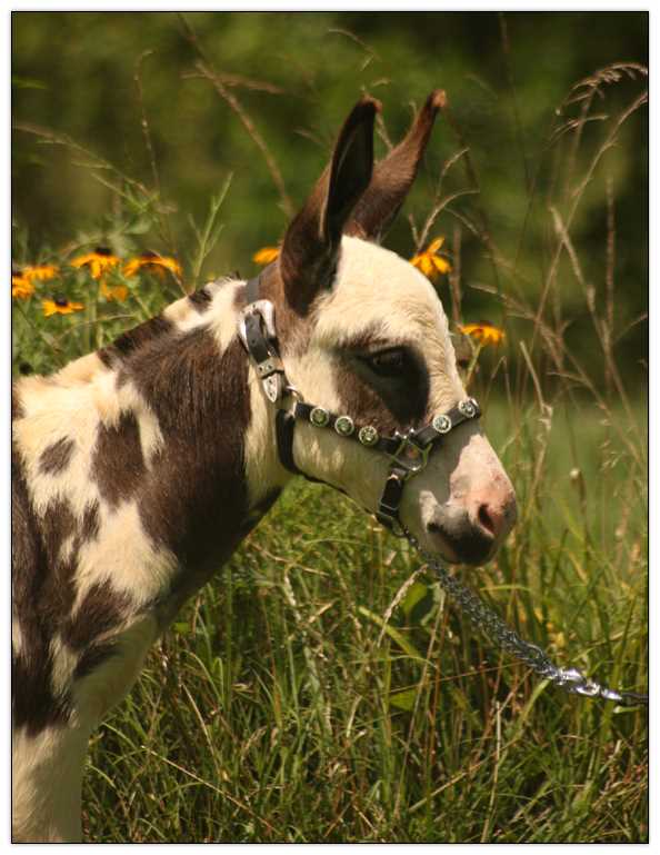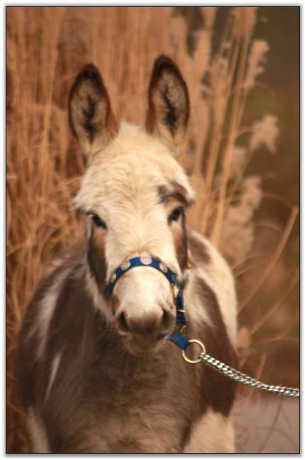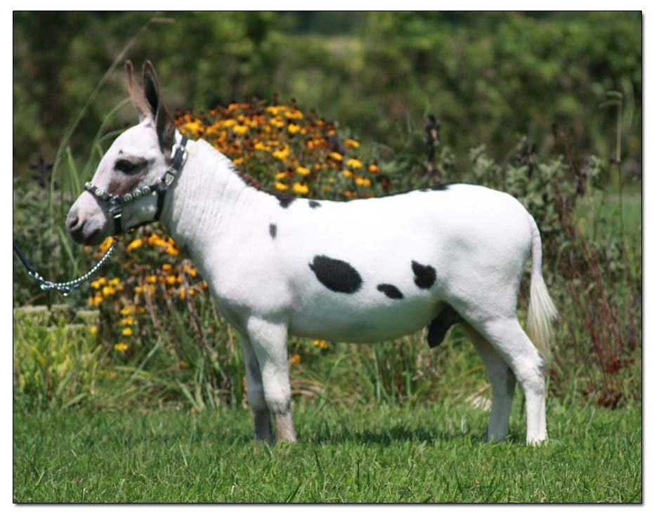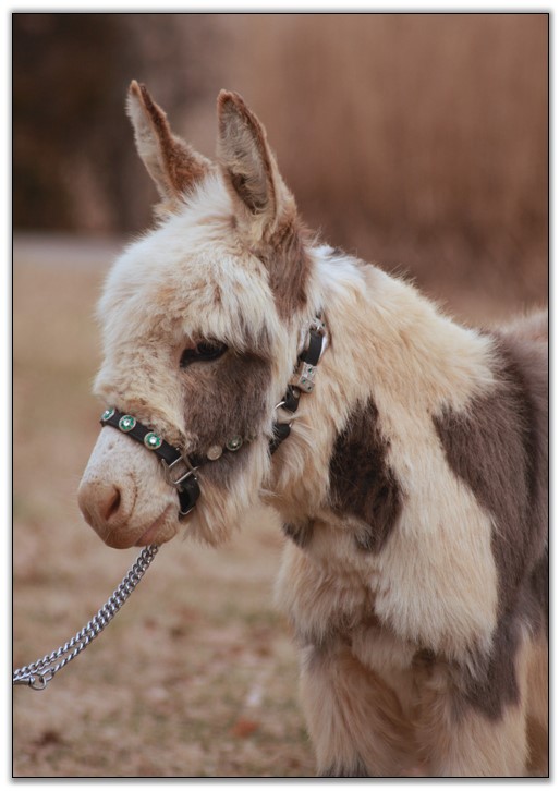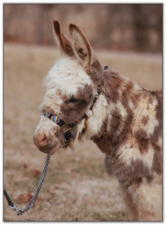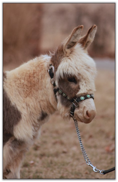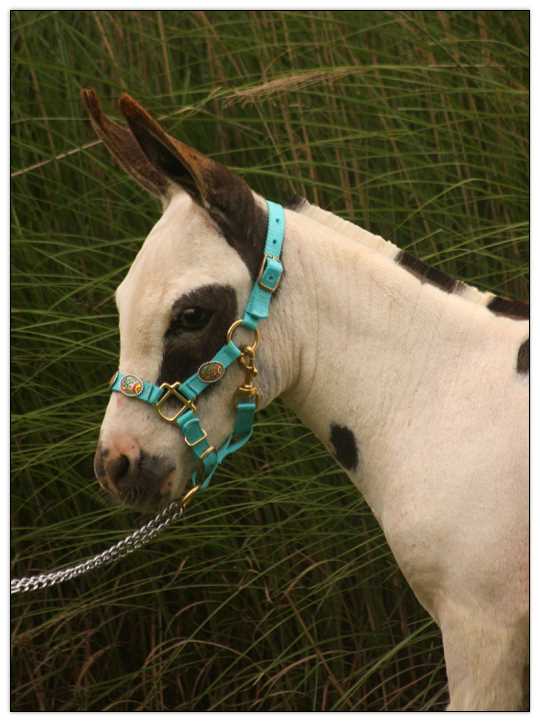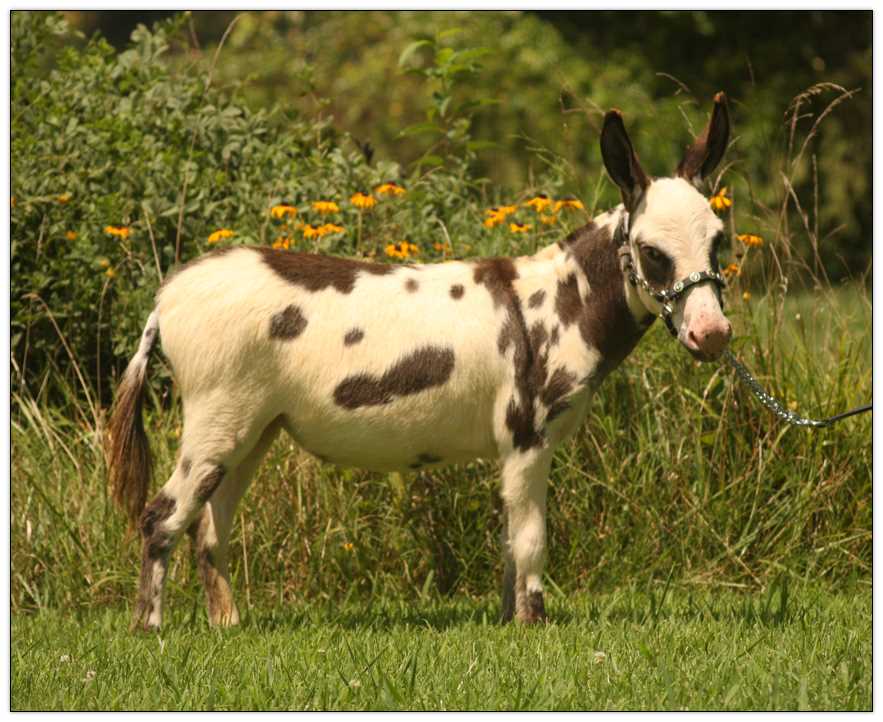 HHAA Tramp Stamp, spotted miniature donkey jennet born at Half Ass Acres Miniature Donkey Farm in Chapel Hill, Tennessee.
