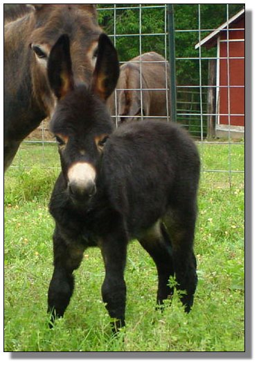 Doll is Paper Tyger's first foal and her sire, brick's, first jennet. Paper Tyger just spit herself out and reproduced a foal that looks exactly like herself and has the same adorable personality. She appears to be a very dark brown jennet but we cannot see a cross so she will probably clip off to be a near black jennet just like her mom when she is mature. I do not see one single thing I do not like about this little girl. She will mature closer to her sire's height than her dam's. She is square, straight and balanced and has a perfect bite. She will make a wonderful show donkey, that can retire to the breeding pen when she is mature, or just be a beautiful pet. Named by my former co-worker, Juanita Phariss. Thanks for the neat name Juanita!