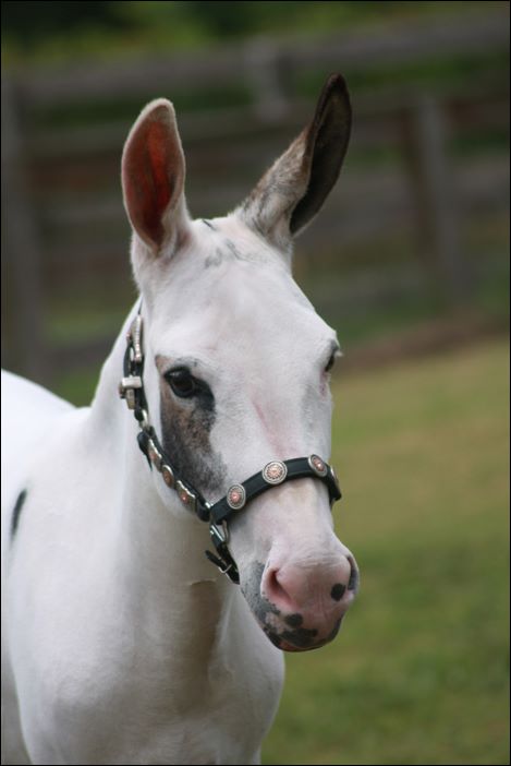 As we watched this little guy being born all we saw was white, and more white, and very few spots. As he dried it was evident that his few tyger spots had been delicately placed to perfection. He has dark spots around his eyes with dark eyeliner (guyliner!) all the way around both eyes, three tear drop tyger spots on his left shoulder, on his mid section, back of legs, and ears.  All of his spots have deep halos around each one which means his spots will never change. When he was completely dry his coat resembled lofty clouds floating in the clear blue sky. He stood there with a presence of beauty rarely seen in a new born jack….and he weighed 31 lbs. standing 22.¼" and built like a tank!!! If he had arm muscles I’m sure he would have flexed them to all the other donkeys as if to say, “JEALOUS MUCH?” He is a one of a kind boy!
