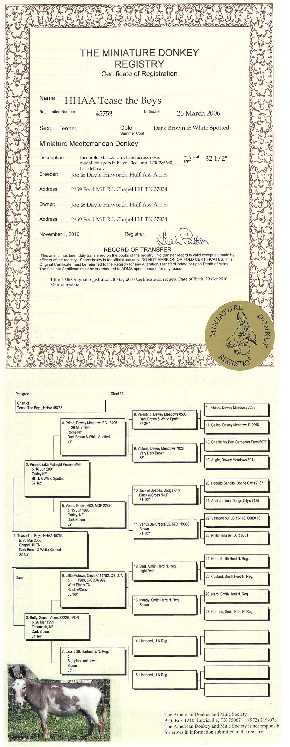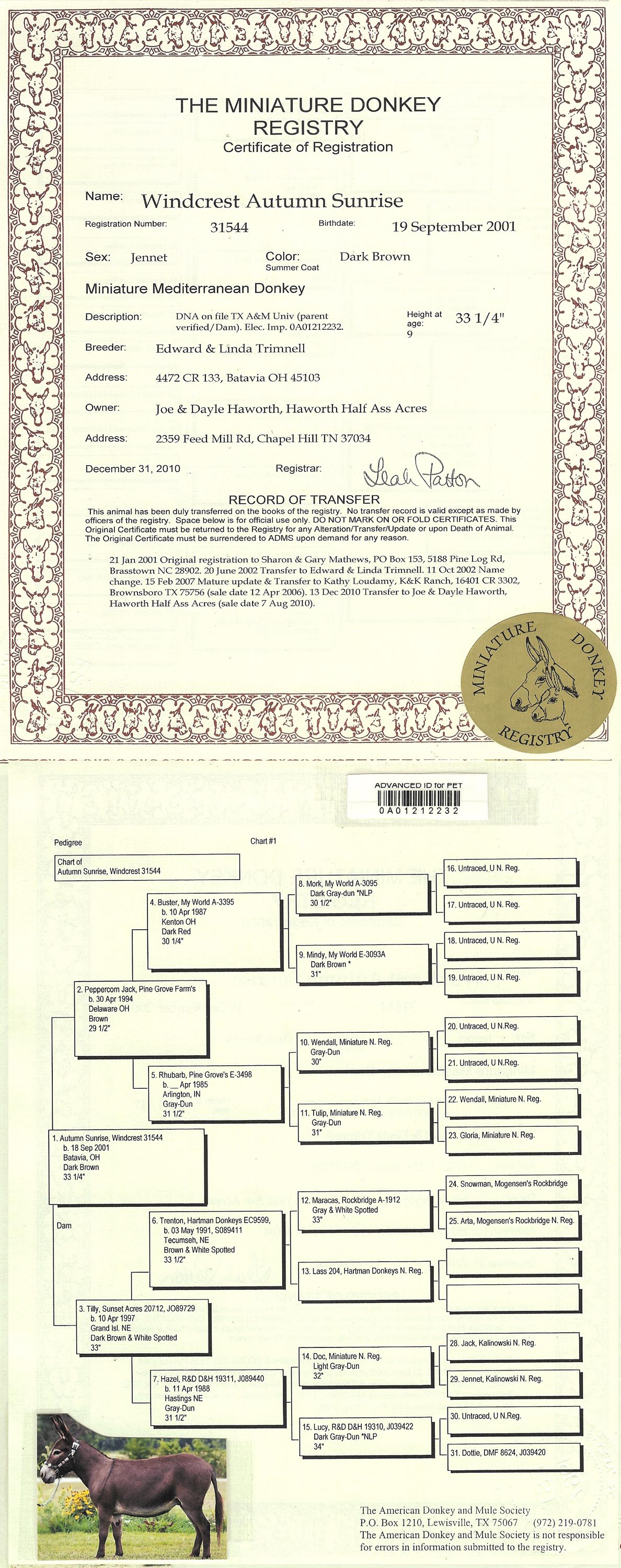 Click MDR sign for Miniature Donkey Registry Pedigree Doll's pedigree!