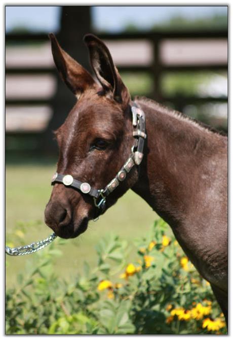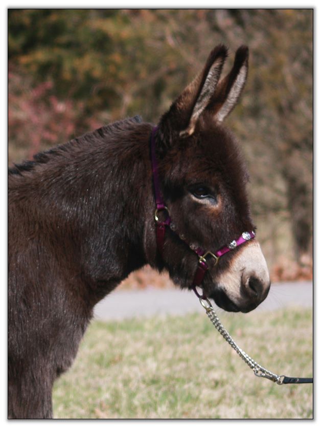 What a dark little doll she is. Her dam is a very nice 31¾" dark brown daughter of Top Gun. Her sire is 303/8" Little Buckaroo who is drafty and black with no cross. We purchased Ramona at The Great American Miniature Donkey Sale in Ohio July 28th, 2007. We are so pleased with her. She is as sweet as she can be. She was so tiny that we waited until she was 4 years old to breed her. Ramona did so well that we now don't breed any of our jennets until they are at least four years of age so that they are a mature five years of age when they have their first foal.