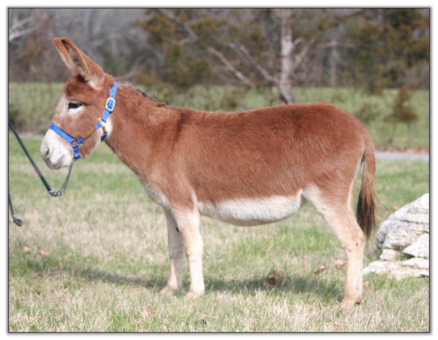 Girlie is being offered first to our customers who have already put down deposits. Lay-a-way payments are fine as long as you send us a payment each month so we will know that you have not forgotten about your donkey. The donkey must be paid for in full before she leave for her new home. We wean our foals at five months of age or later. We will be glad to hold until Christmas or in some cases longer...just ask.  Girlie will be up to date on all vaccinations (including first vaccine and booster three weeks later) of Eastern/Western Encephaliti, Rhino, Influenza, West Nile and Rabies. Her hooves will be freshly trimmed and she will be up to date on de-worming as well. Girlie will come with a brand new halter and lead rope.