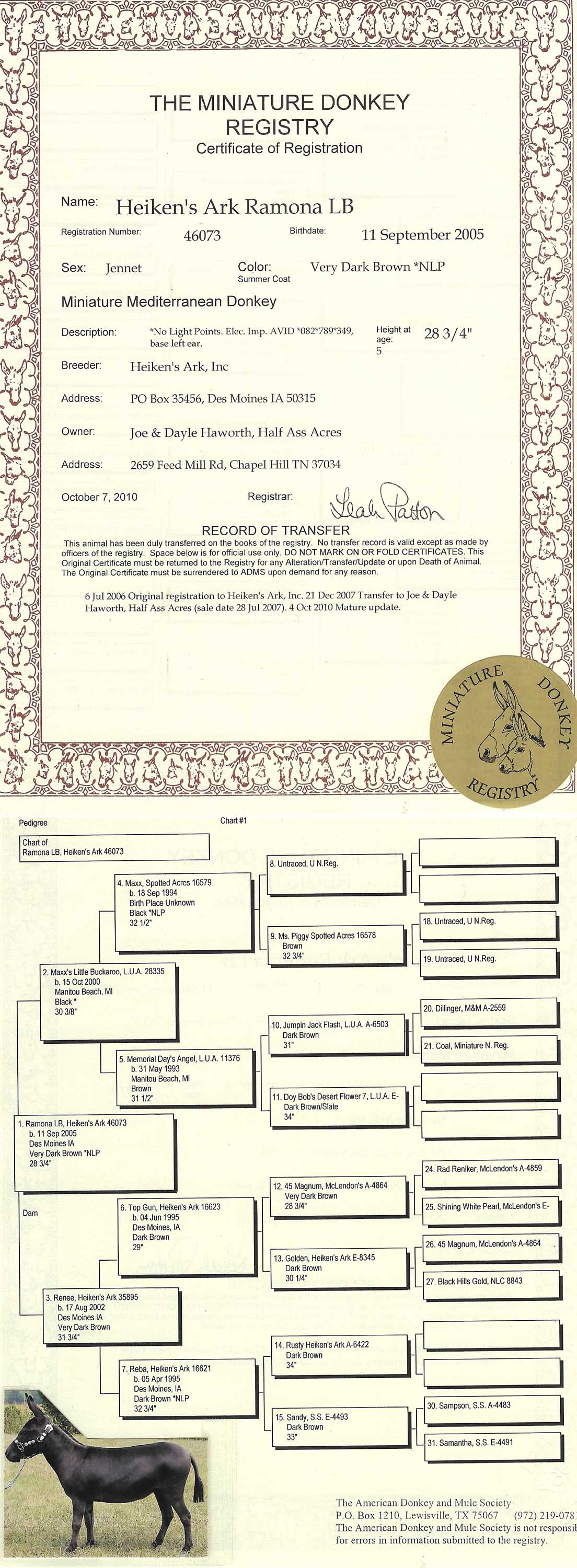 Click MDR sign for Miniature Donkey Registry Pedigree Ramona's pedigree!
